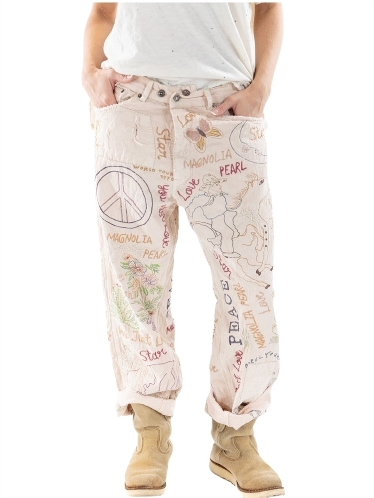All-Over Embroidery “You Just Love”, “Compassion”, “Star”, “Magnolia Pearl”, “Neil Young”, “Revolution”, Peace Signs, Cactus, Flowers, Cowboy, Butterfly, Bird w/Guitar, etc.