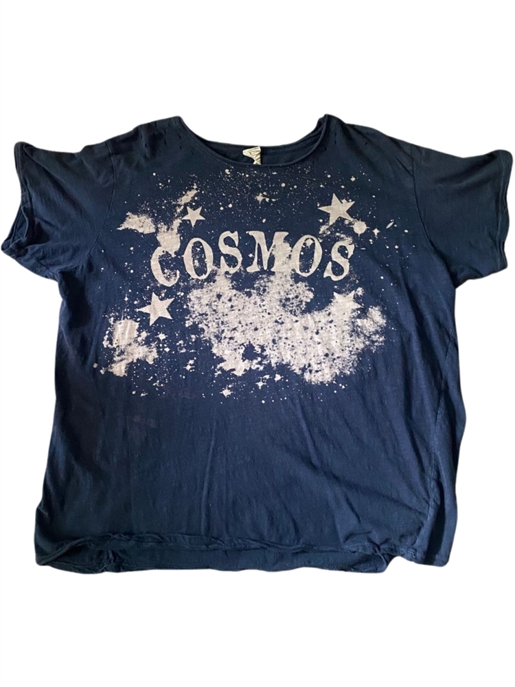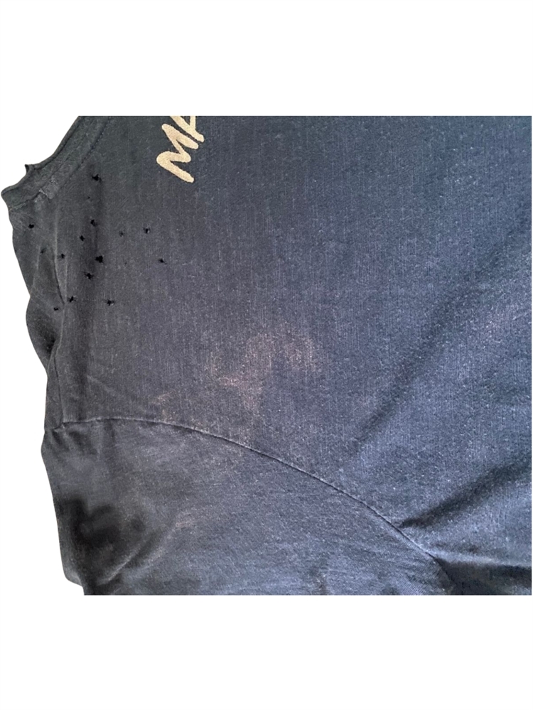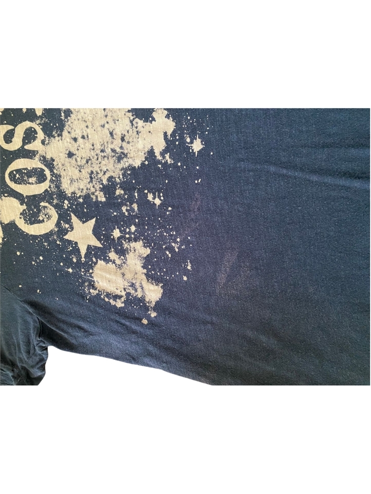 Small bleach or sun stains throughout from wear, most noticeable ones on left back above sleeve and lower front right side under print. I don’t find these even that noticeable when actually wearing but if you lay it flat they are noticeable and I wanted to mention them. In my opinion these just add to the beauty and uniqueness of the item. See pictures