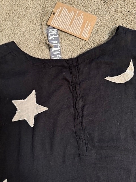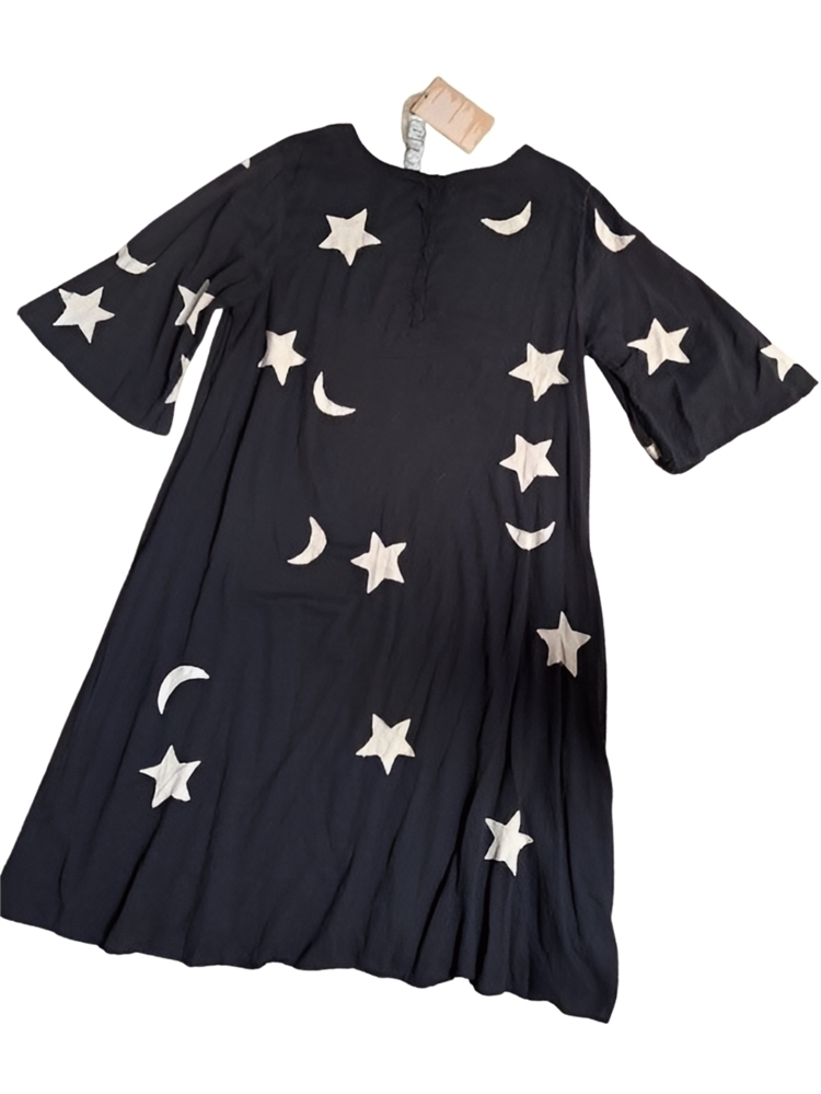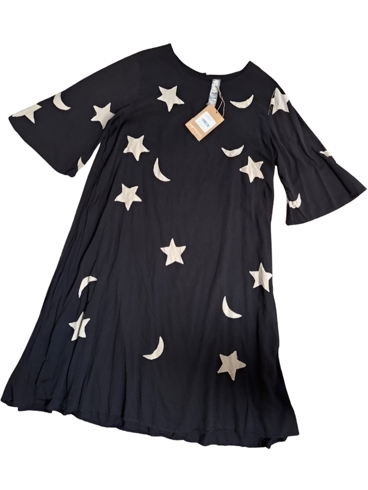 NWT - Cotton Twill Start and Moon Applique Merlina Dress with Hand Fading and Distressing. Color - Midnight. Very cute lightweight A-line dress with appliqued stars and moons all over front and back; bell sleeves; buttons at the back neckline. Flowy, versatile and sweet dress; can be worn under jacket, coat or sweater or layered over pants/jeans.