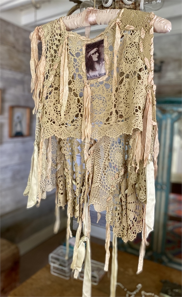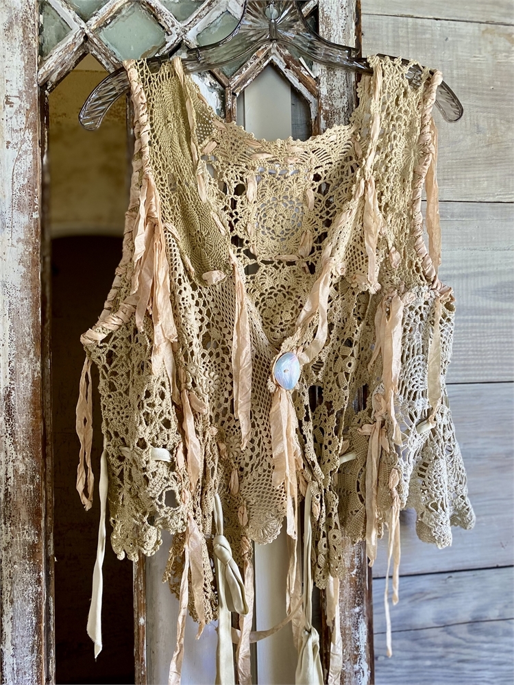 Hand-made, crocheted lace and interwoven silk ribbon ties. Mother-of-Pearl Button.