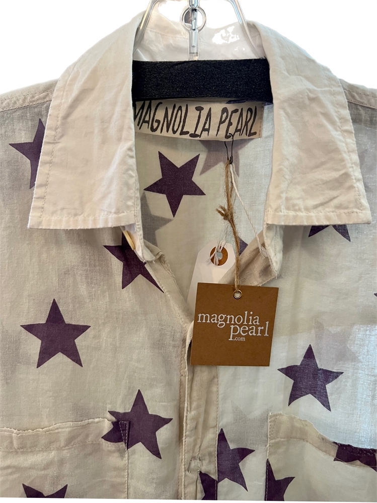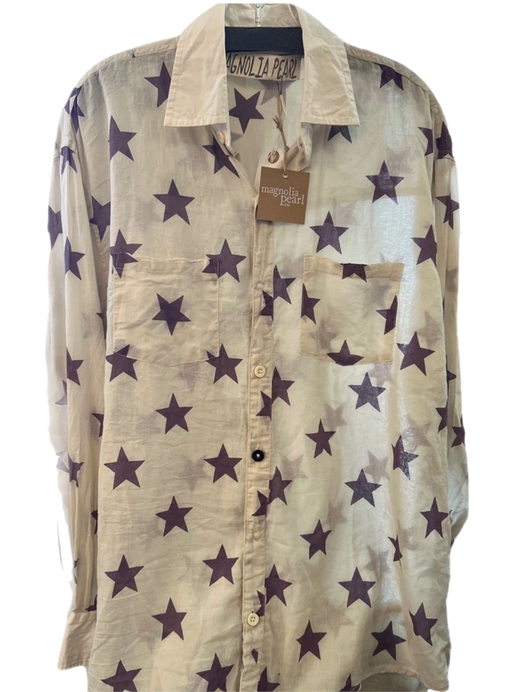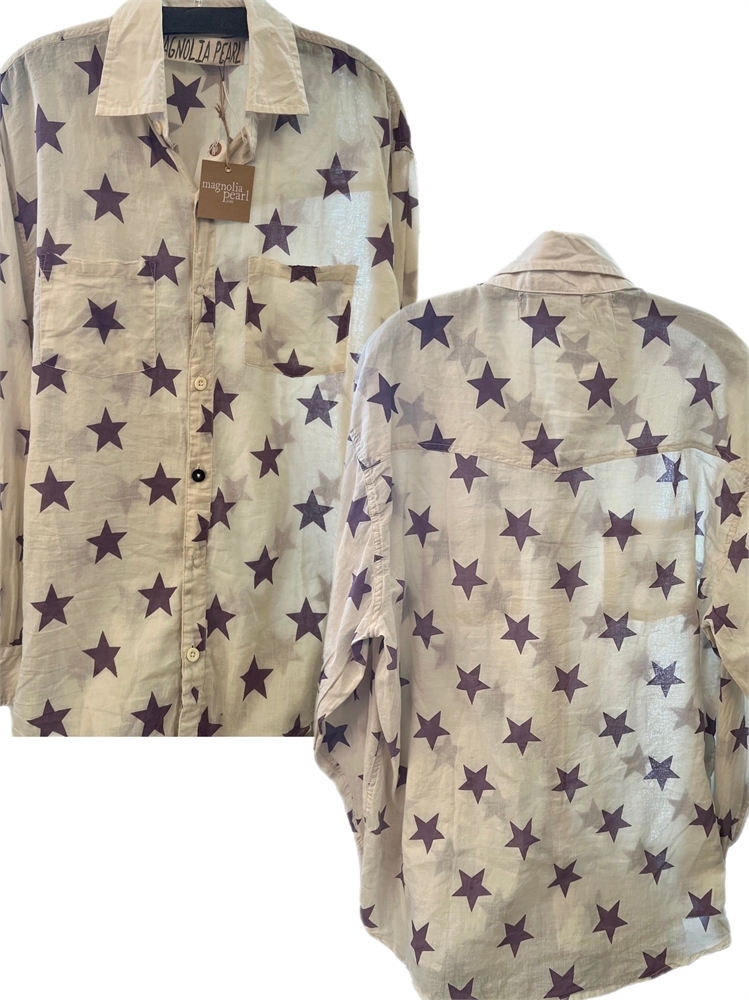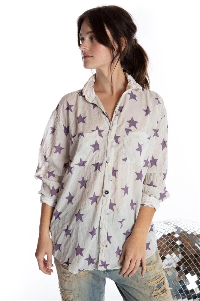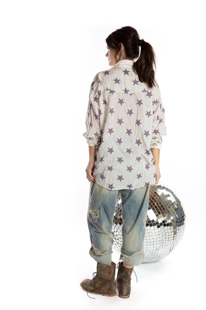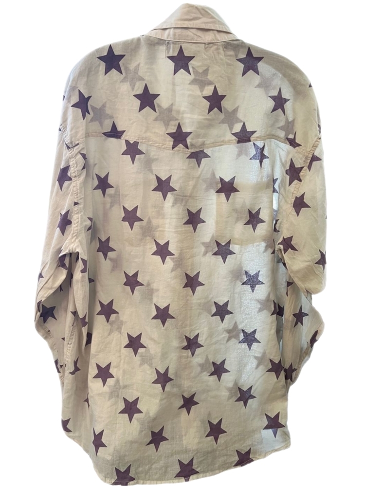 Reach for the stars in this lightweight European cotton shirt with a time worn vibe. A one size top with a contrast poplin collar and cuffs. It closes in front with an artful mix of buttons and snaps, chest pockets complete the lived in look.