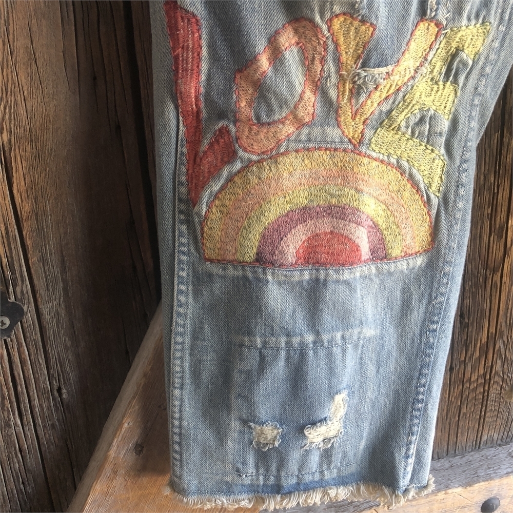 If you have an opportunity to visit the Fredericksburg, Texas flagship store, a pair of jeans from the 1960's is prominently displayed. The 1960's jeans inspired Robin to create this pair of denim jeans, the LOVE appliqué denim overalls and other Love Collection pieces.