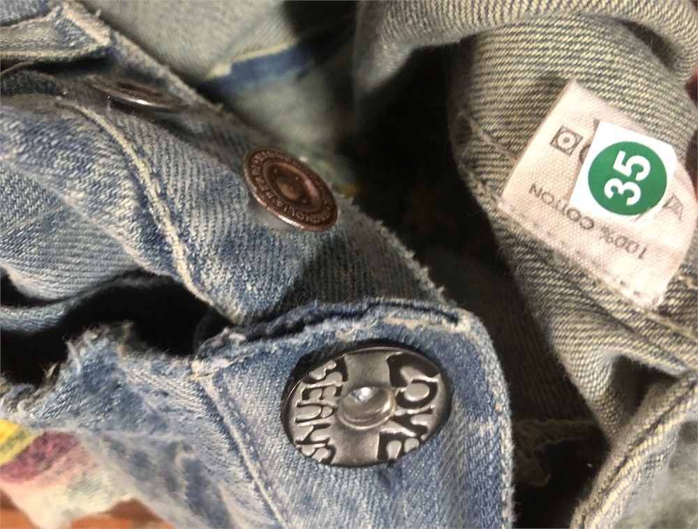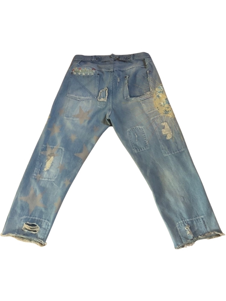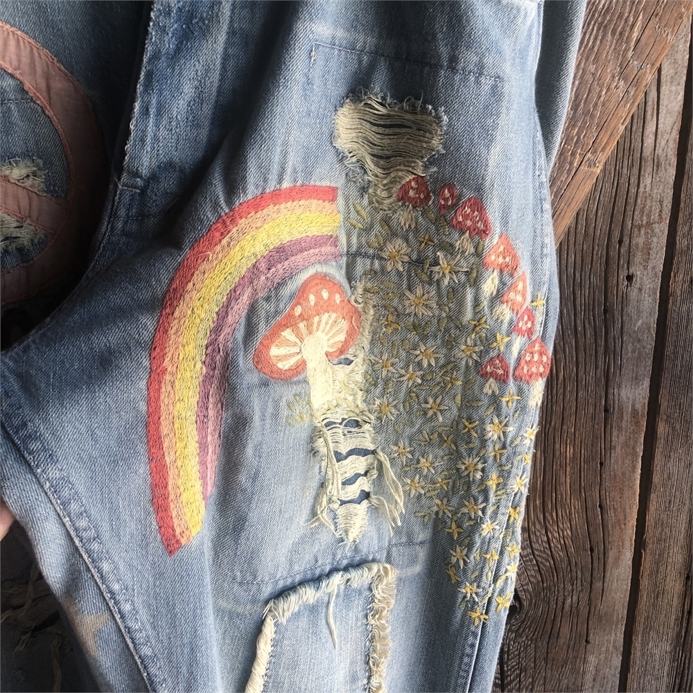 On the BACK of the Jeans: Hand-painted Stars; Embroidered Mushrooms and Yellow Daisies above the left pocket, Embroidered Sun Rays with the Sun made out of Yellow and Blue Fabric.