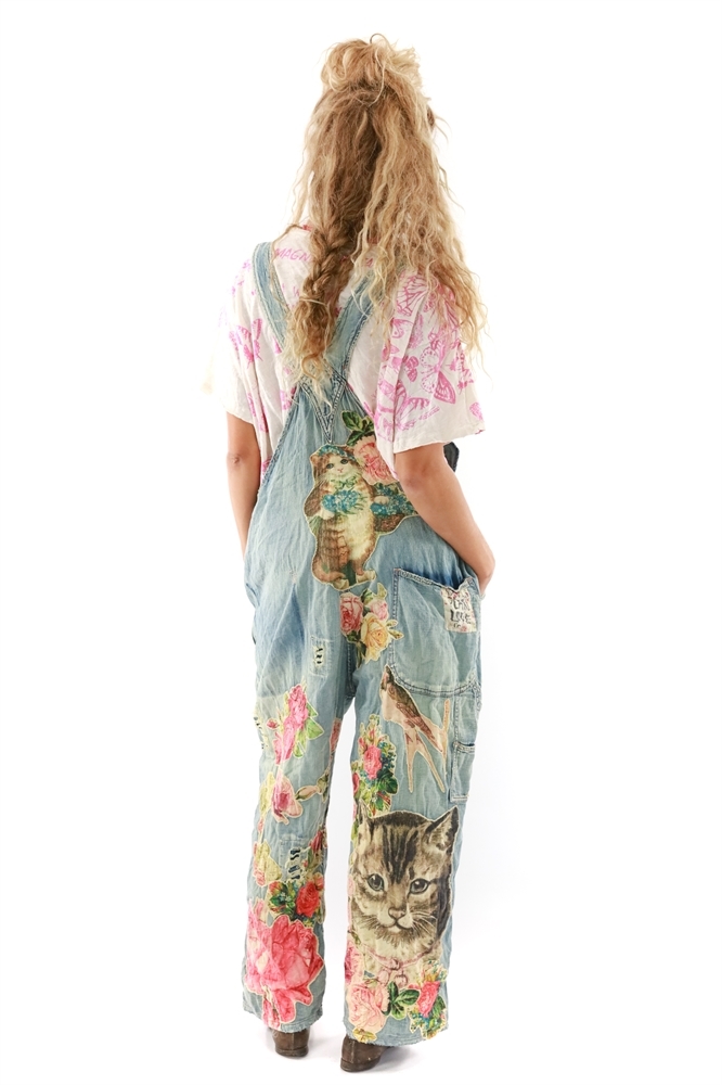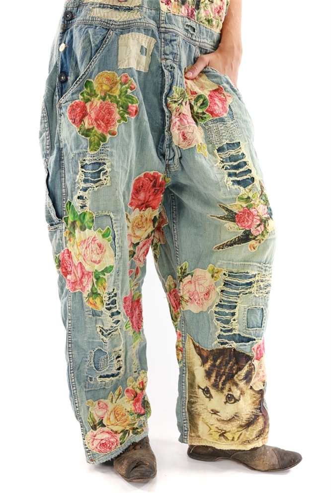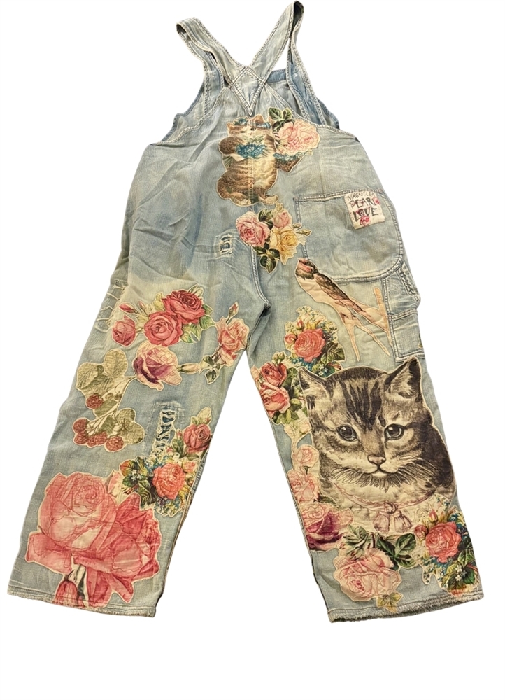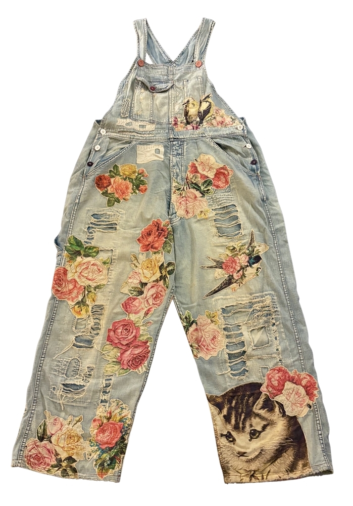 One size fits all cotton denim overalls with appliqué birds, flowers, and kitty. Hand-fading, distressing, patching, mending, and stitching.