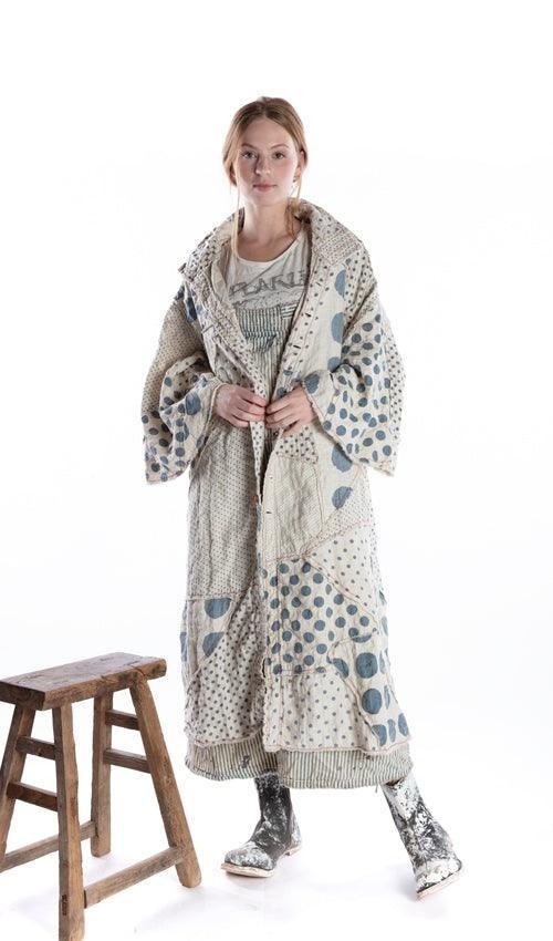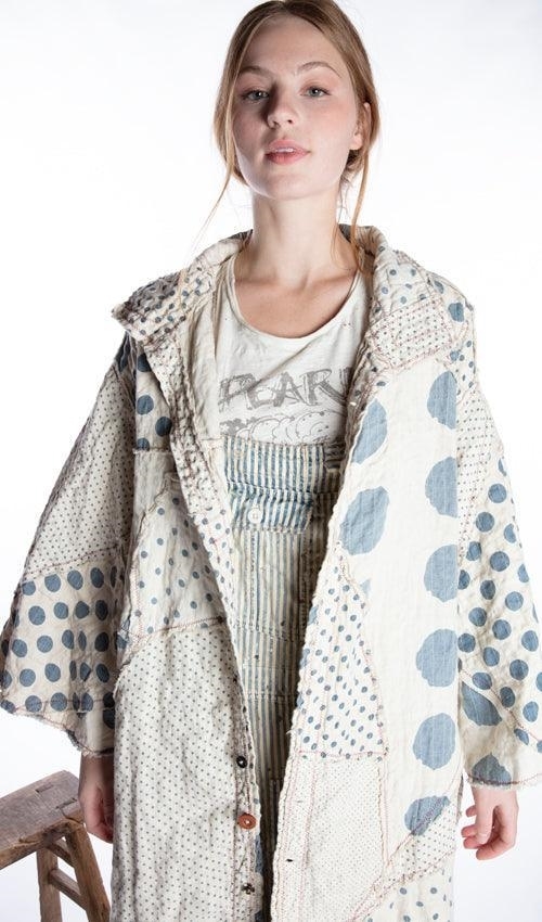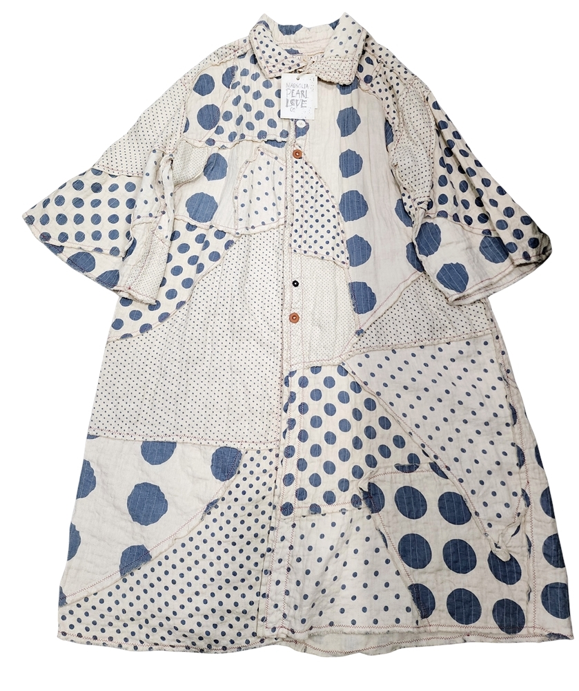 A triumph of creative expression, the one size Sila Coat has a quilted linen texture and a patchwork pattern. Raw edges throughout add vintage flair, it falls to mid calf with a mix of buttons and snaps to close the front. Finished with flared long sleeves and a charming mix of polka dots that range in size from tiny to bold.