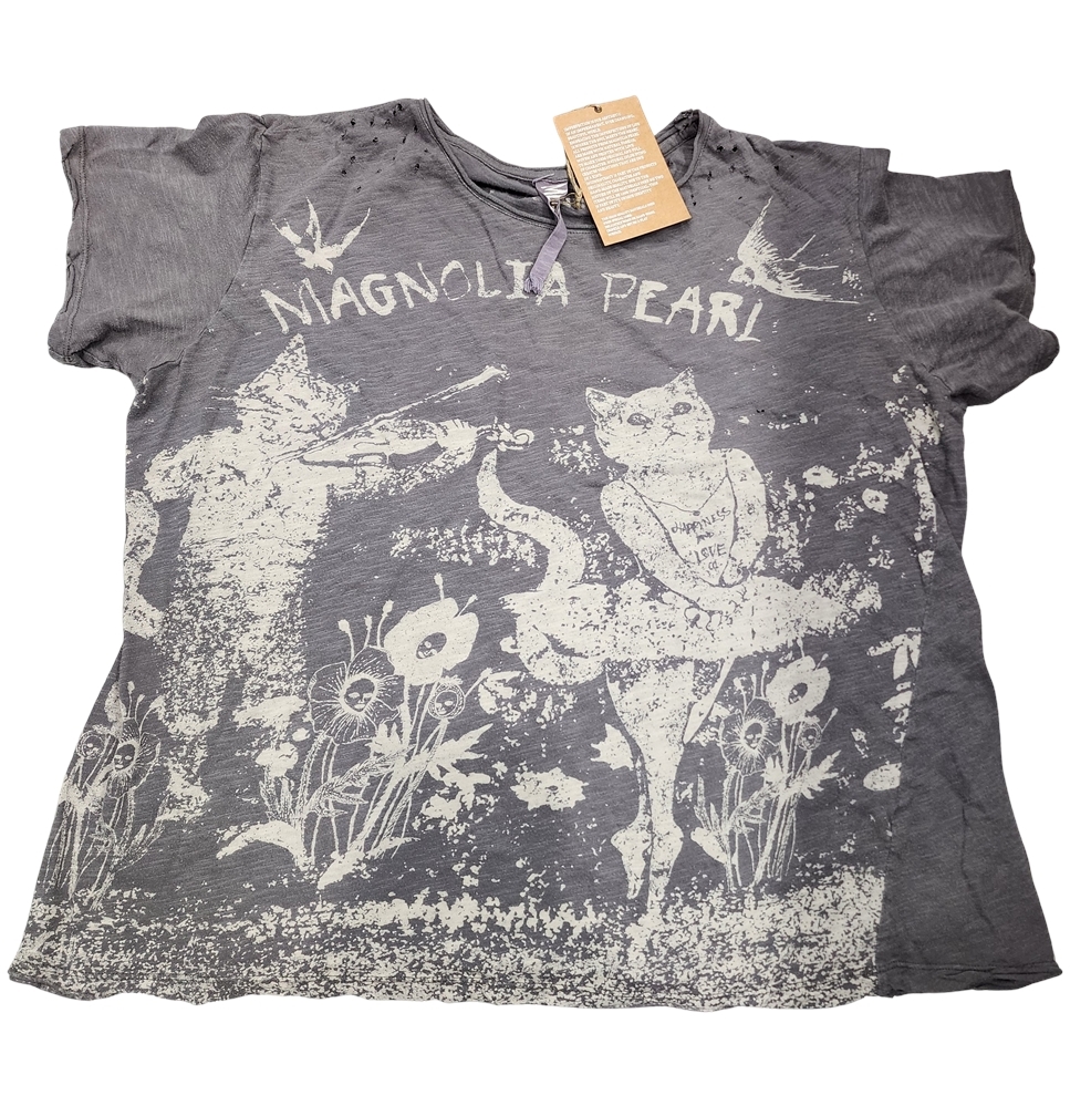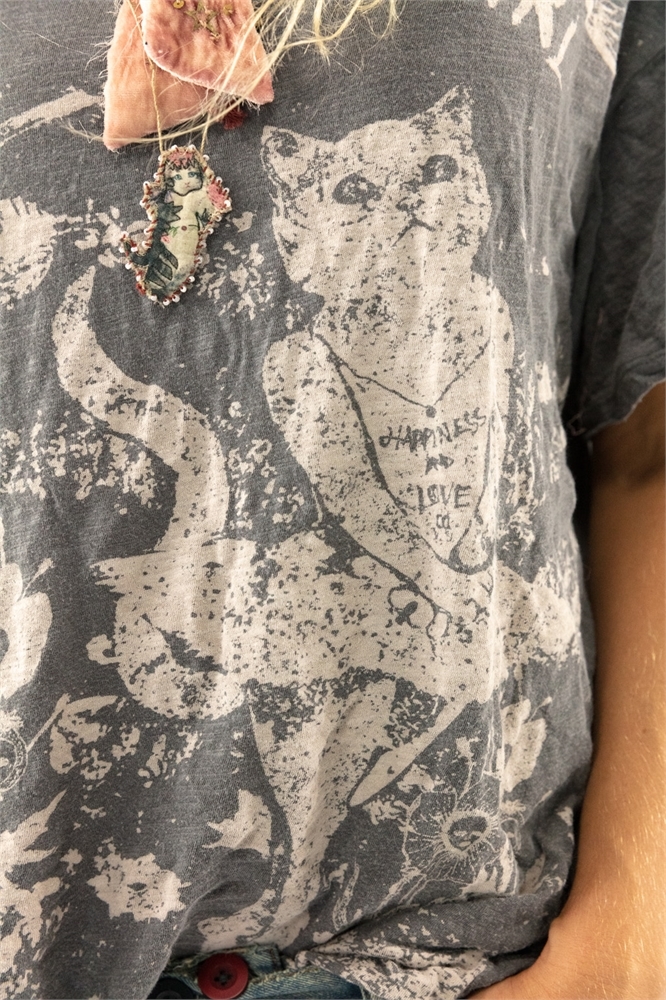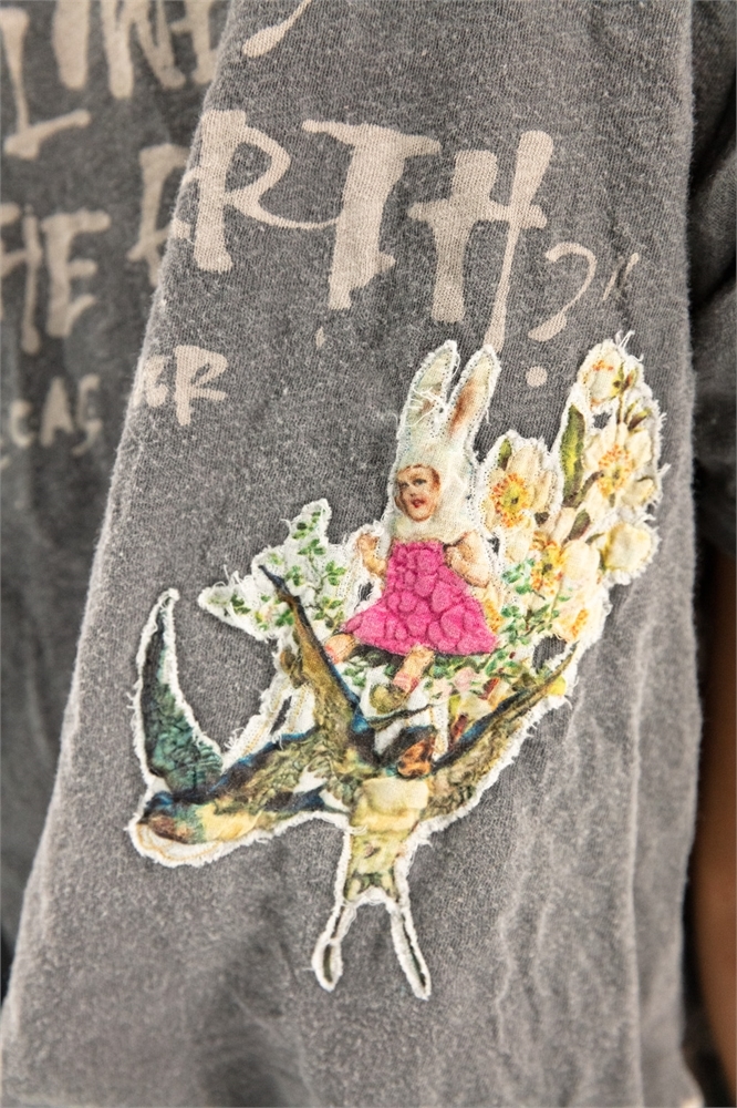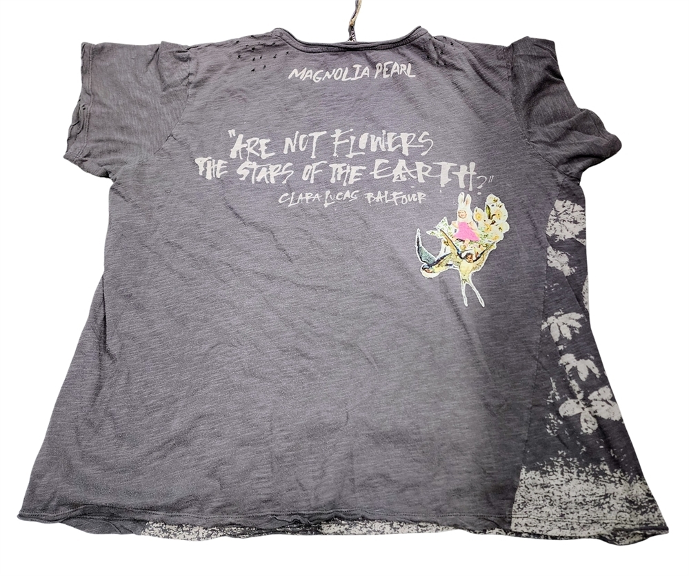 A great basic, this soft cotton tee has a relaxed boyfriend fit and a well loved look. It has raw edges at the round neckline, short sleeves and hemline, purposeful holes near the shoulders and the Magnolia Pearl logo at the back neckline. Furry friends play and dance in front, the back has a flowery quote and a floral applique.