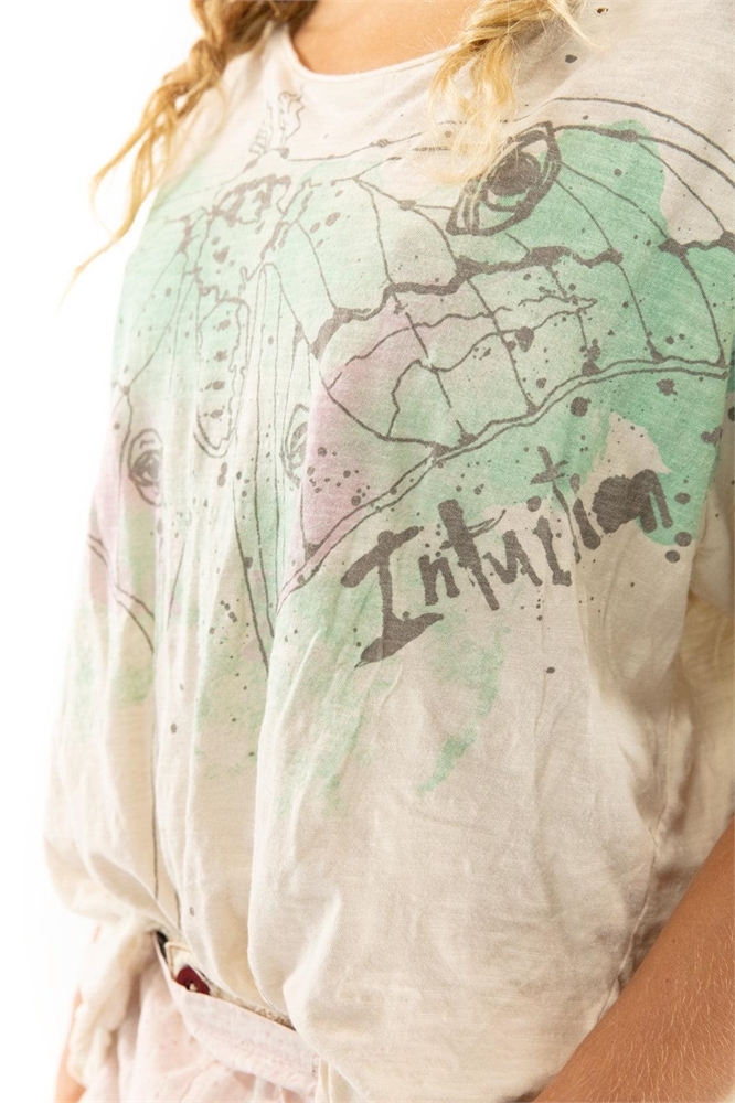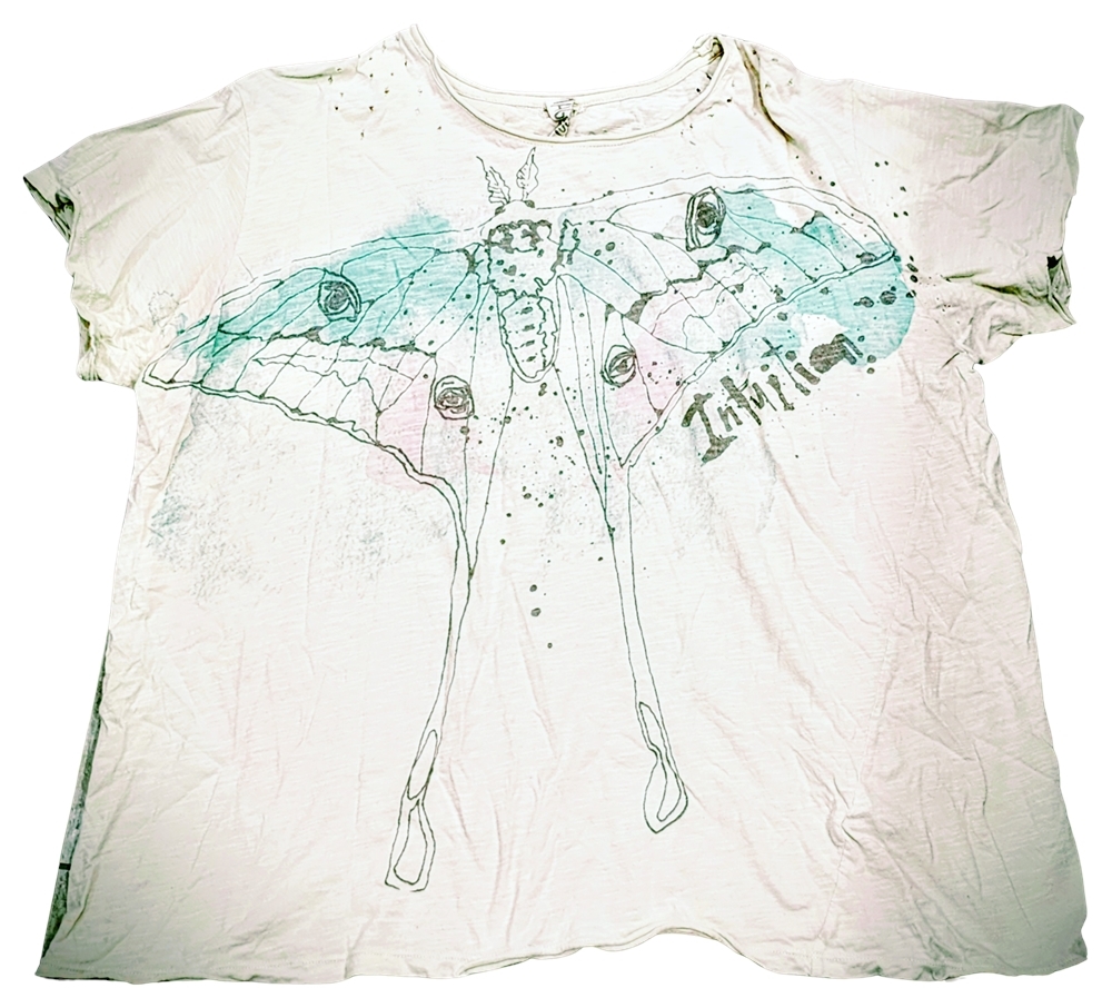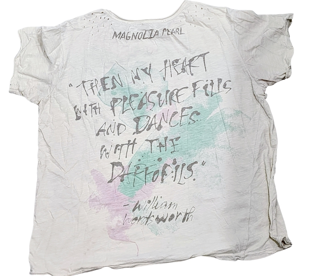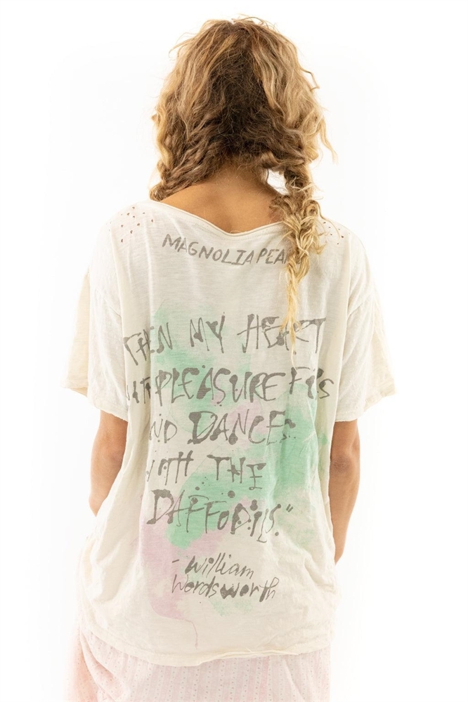 A great basic, this soft cotton tee has a relaxed boyfriend fit and a well loved look. It has raw edges at the round neckline, short sleeves and hemline, purposeful holes near the shoulders and the Magnolia Pearl logo at the back neckline. A winged creature in front and an inspirational Wordsworth quote in back.
