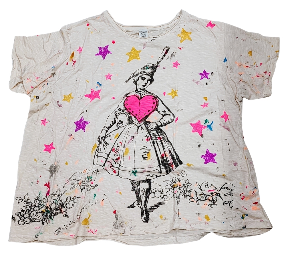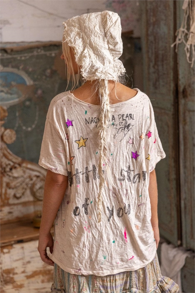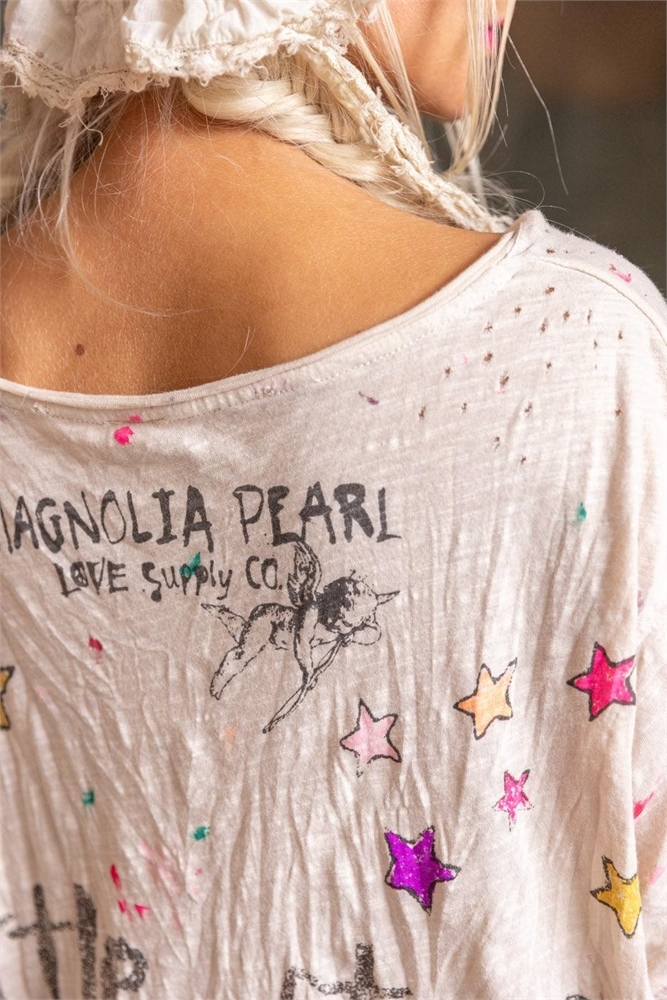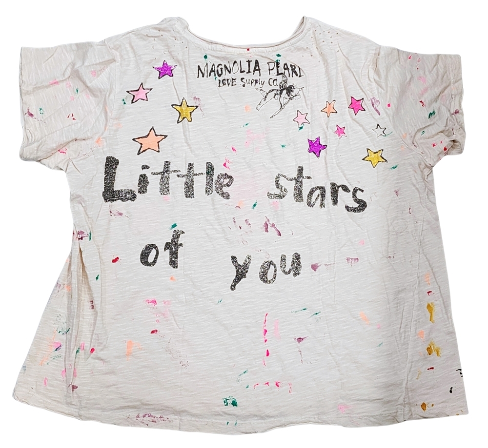 A great basic, this soft cotton tee has a relaxed boyfriend fit and a well loved look. It has raw edges at the round neckline, short sleeves and hemline, purposeful holes near the shoulders and the Magnolia Pearl logo at the back neckline. A fancy, big hearted woman is surrounded by vibrant stars with the Mag Pearl logo and a "Little Stars of You" quote in back.