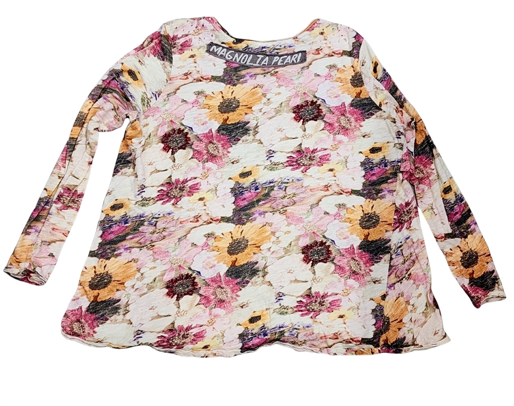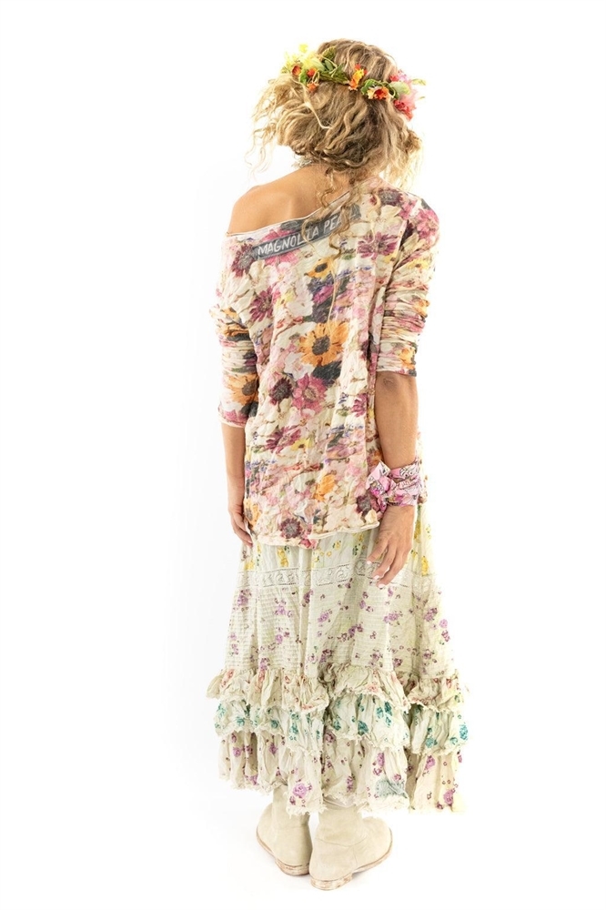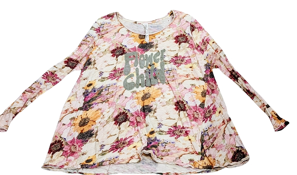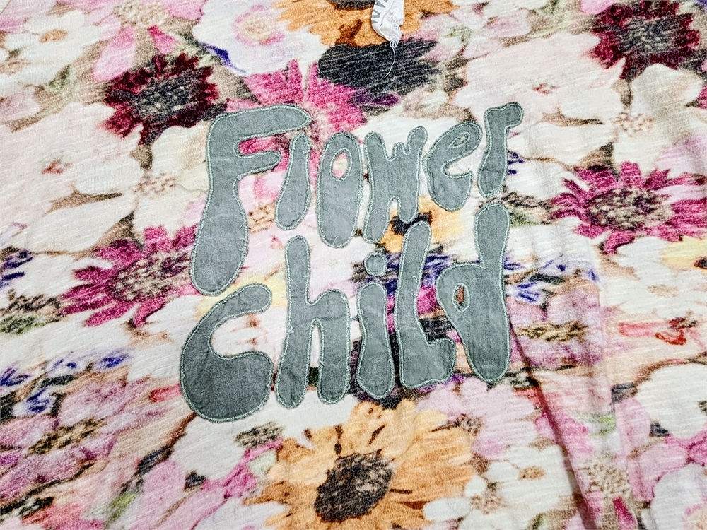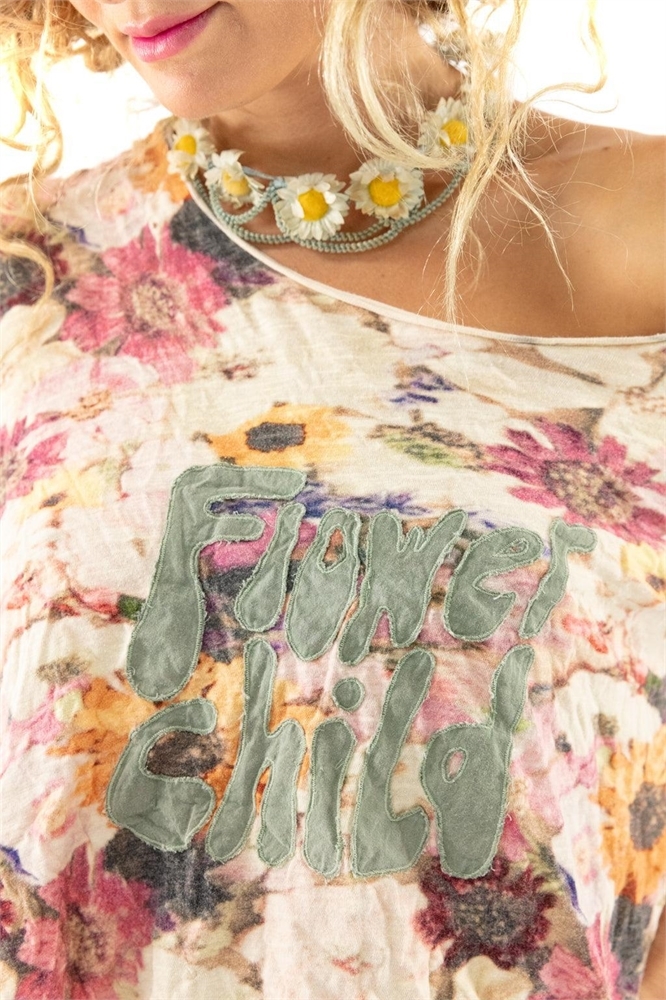 Lounge well in this cotton jersey one size tee with boho chic appeal. It has rolled edges at the round neckline, long tapered sleeves and an intentional sprinkling of holes around the shoulders. An easy basic that's great for layering. Awash in romantic blooms with a Flower Child applique in front.