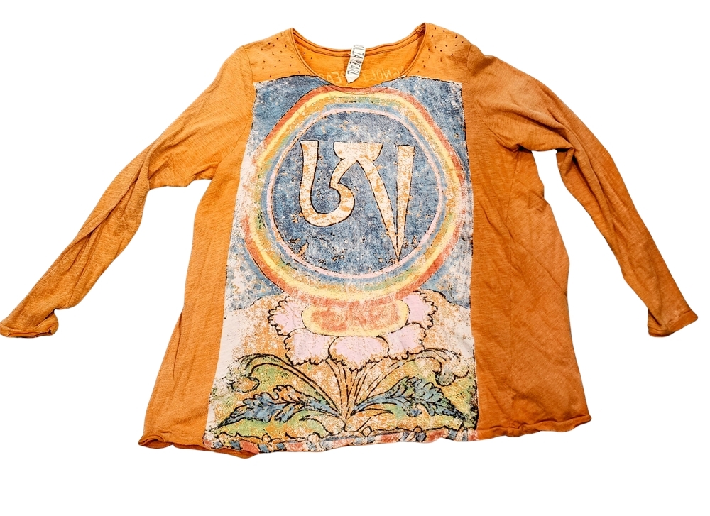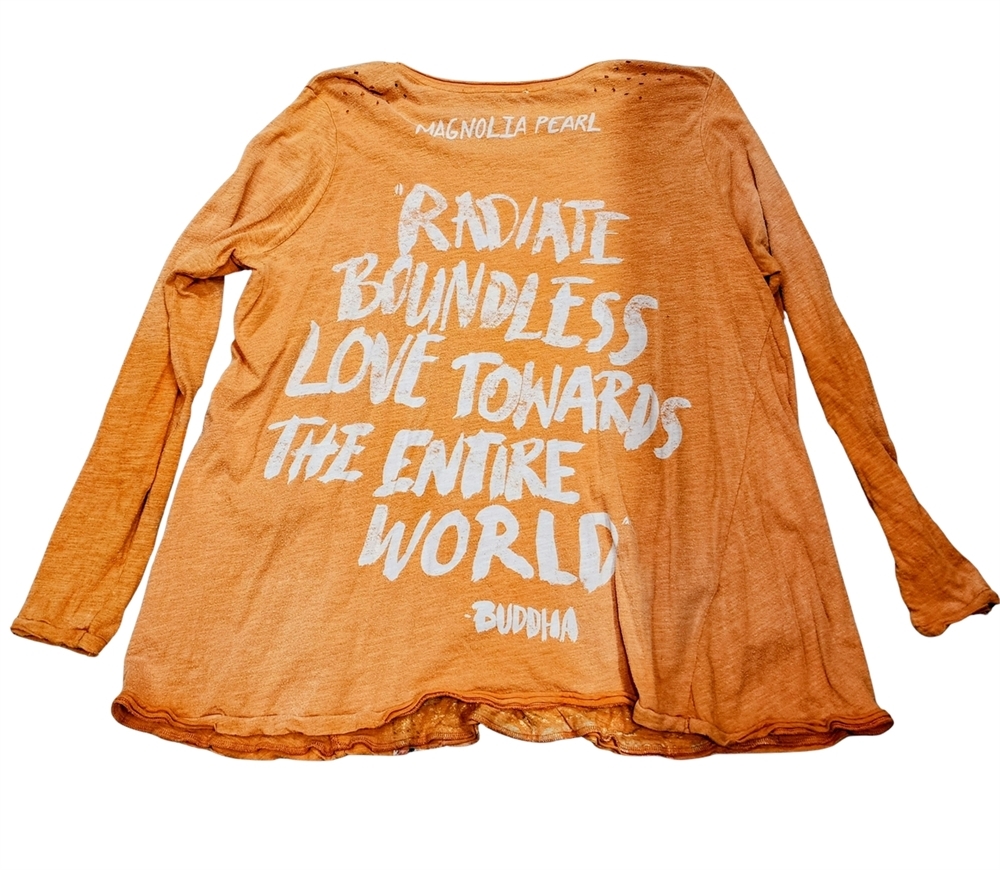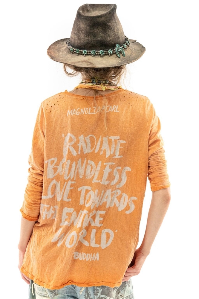 Lounge well in this cotton jersey one size tee with boho chic appeal. It has rolled edges at the round neckline, long tapered sleeves and an intentional sprinkling of holes around the shoulders. An easy basic that's great for layering. Buddha advises we "Radiate boundless love towards the entire world".