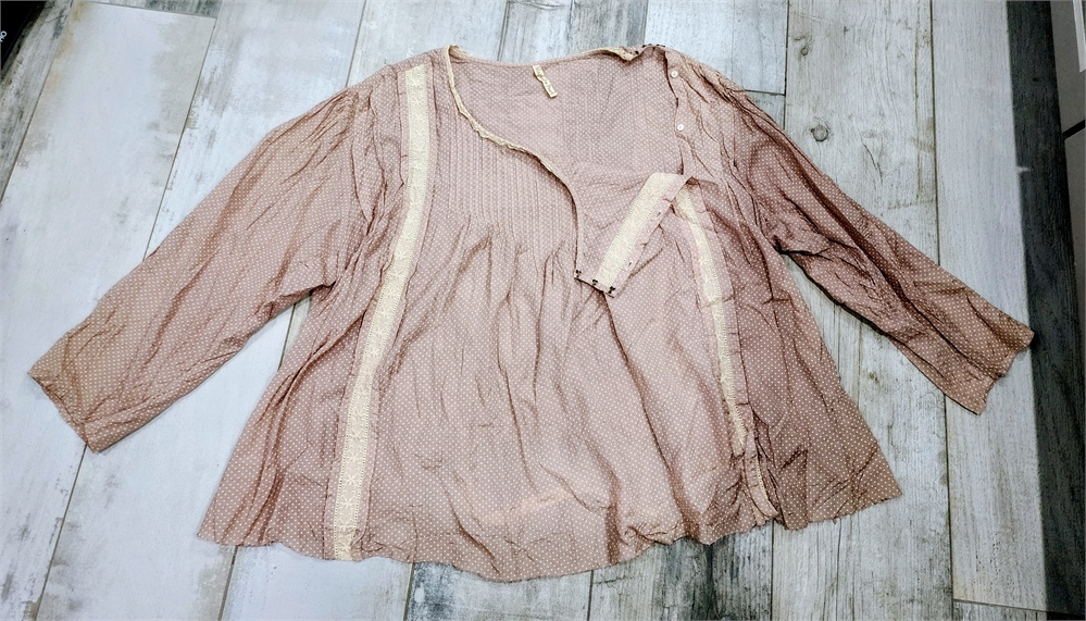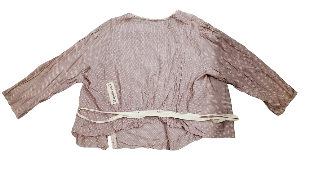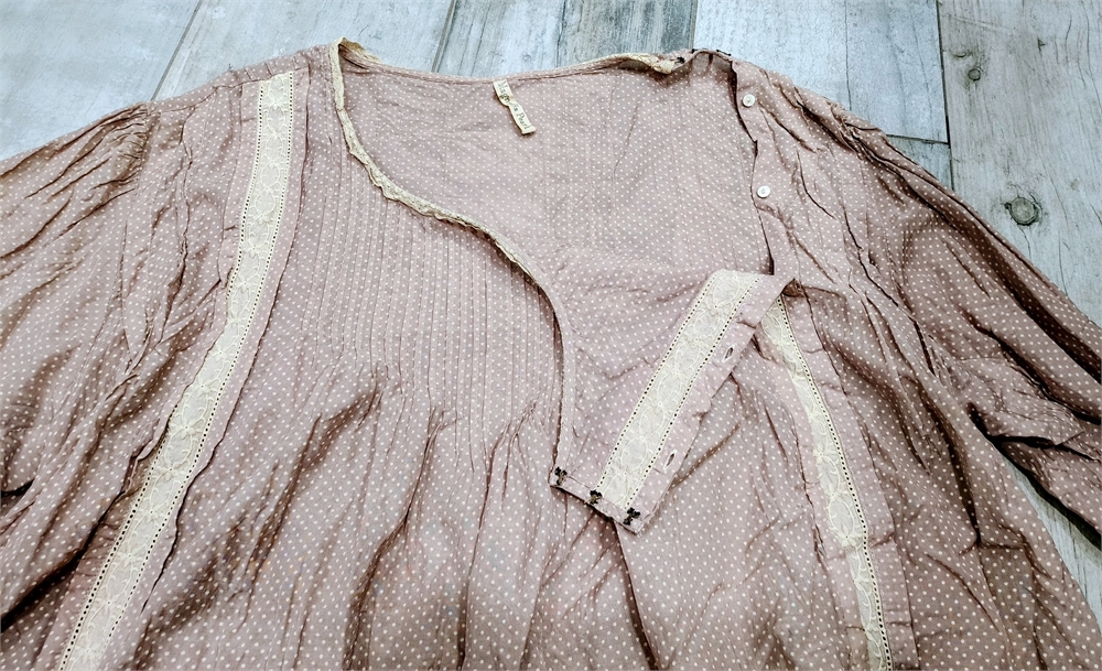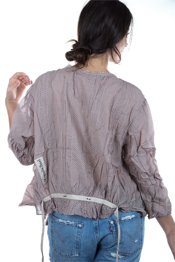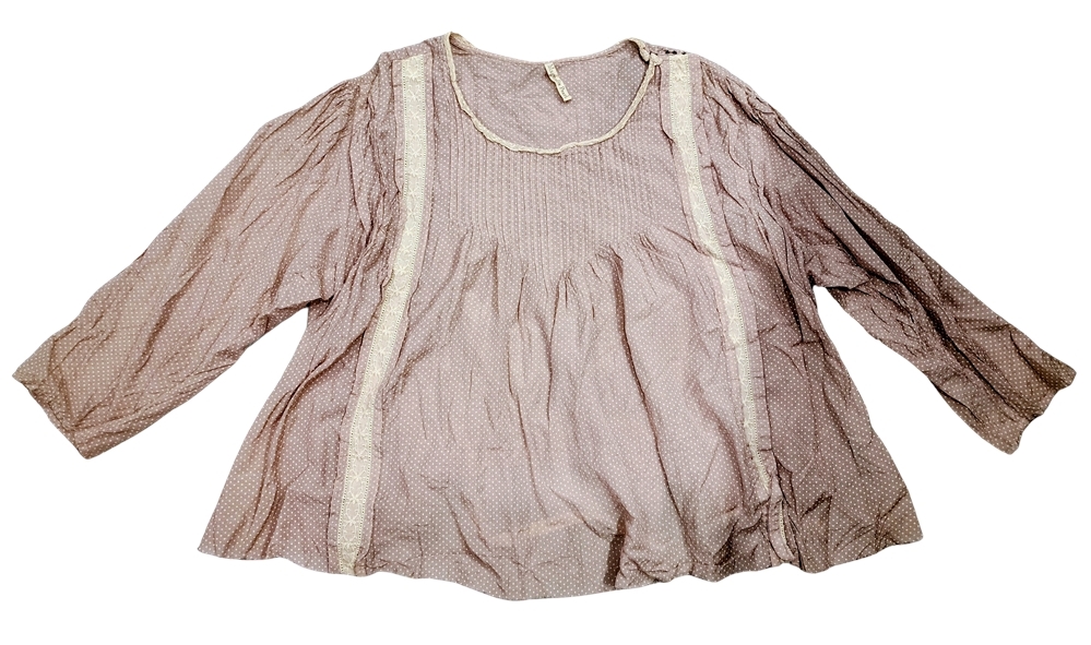 EUROPEAN COTTON ELLIE TOP W/ PINTUCKS, COTTON LACE, EMBROIDERED COTTON EYELET AND MOTHER OF PEARL BUTTONS DOWN THE SIDE - LILA SMALL DOT,