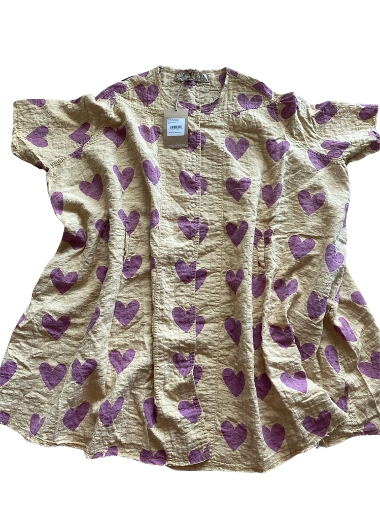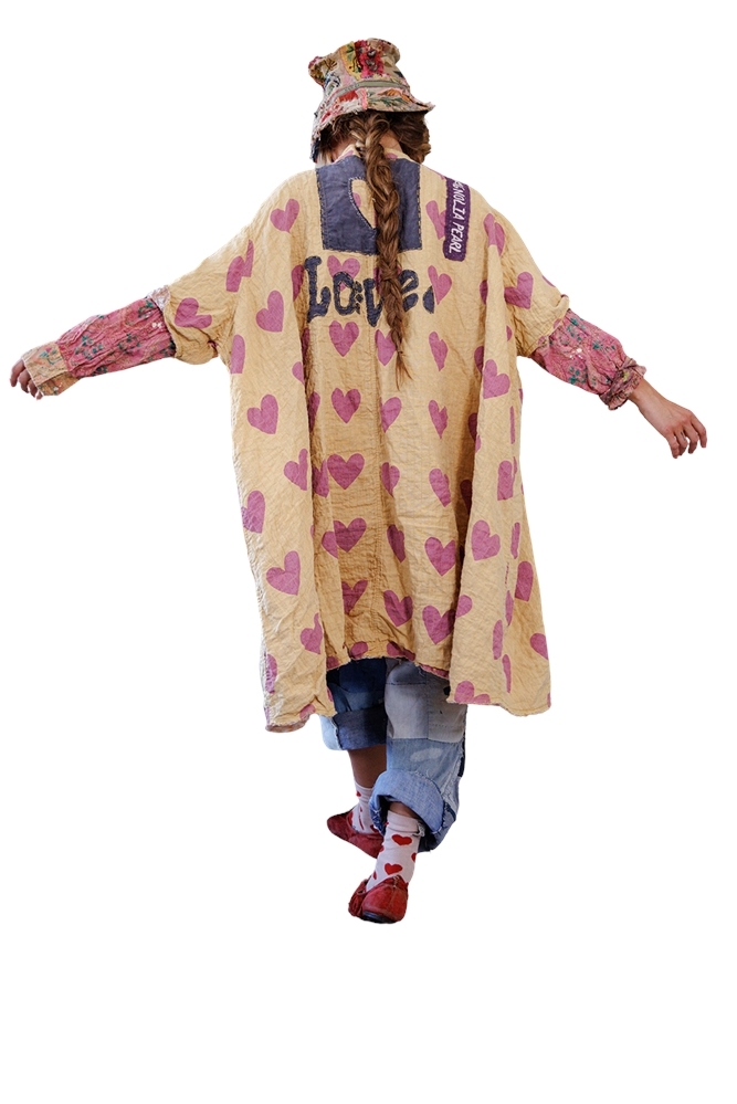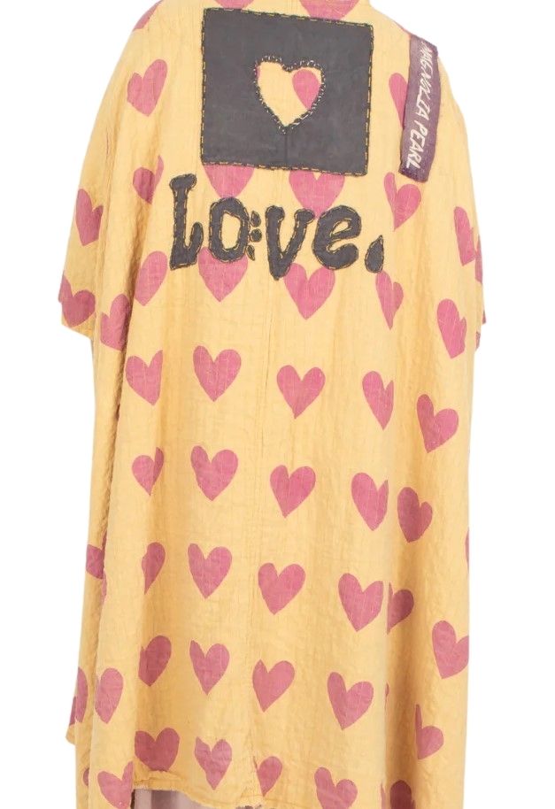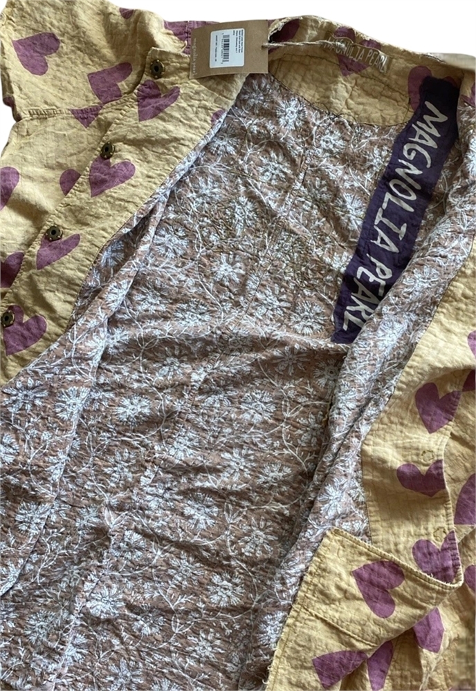 Brand new with tags Heart Kimi Coat from Magnolia Pearl. Loose linen quilted coat. Hand-printed hearts on outside. Appliqué Heart Cutout & "Love" on back.