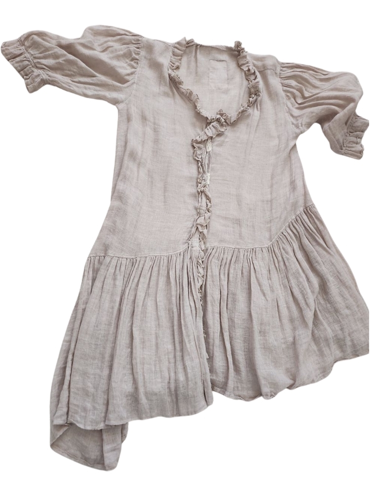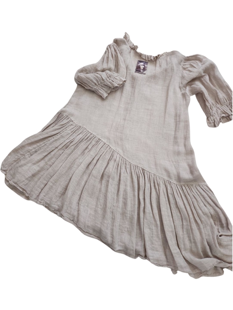 Easy wear linen dress with lovely ruffling and gathered low waisted sloping skirt.